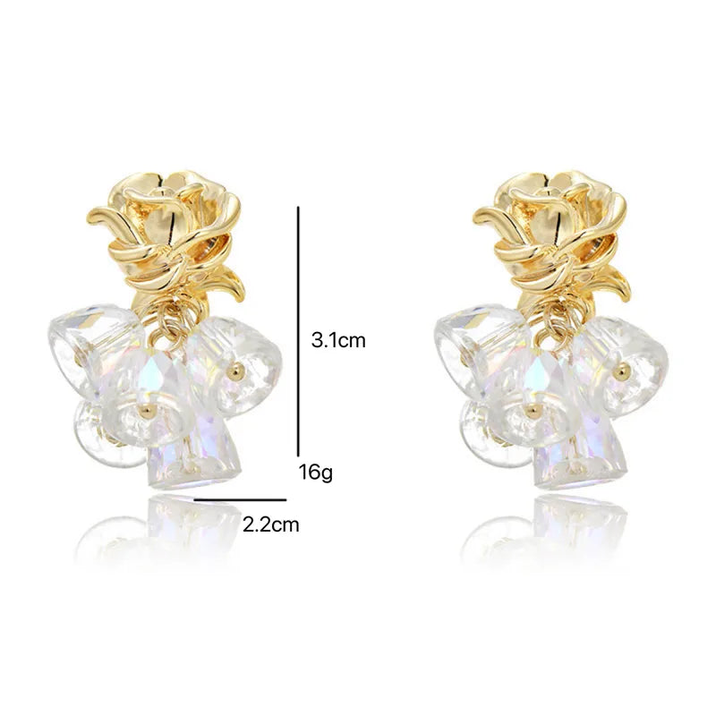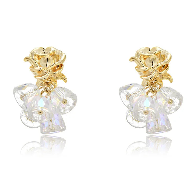 Gold floral studs with iridescent crystal petals, symbolizing beauty and light. A dreamy, sparkling pair perfect for elegant, ethereal looks. Style Sweet, Artistic Design Plating...