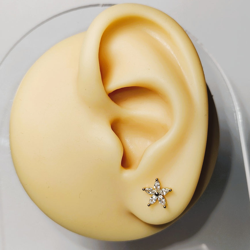 Dainty floral gold studs adorned with shimmering zircon petals. Lightweight, elegant, and timeless perfect for adding effortless charm to everyday looks or elevating your special-occasion style.