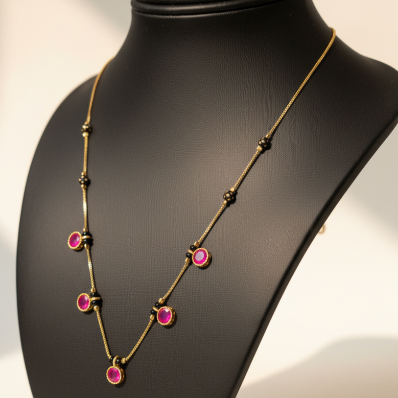 Raina RubyAura Mangalsutra is designed for women who love a pop of color with elegant simplicity. The vibrant ruby-pink stone charms add a bold, festive shine, beautifully contrasted by the fine gold chain and traditional black beads. Lightweight, graceful, and full of personality, this piece effortlessly blends tradition with a modern, royal charm—perfect for both everyday wear and special occasions.