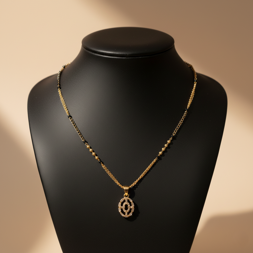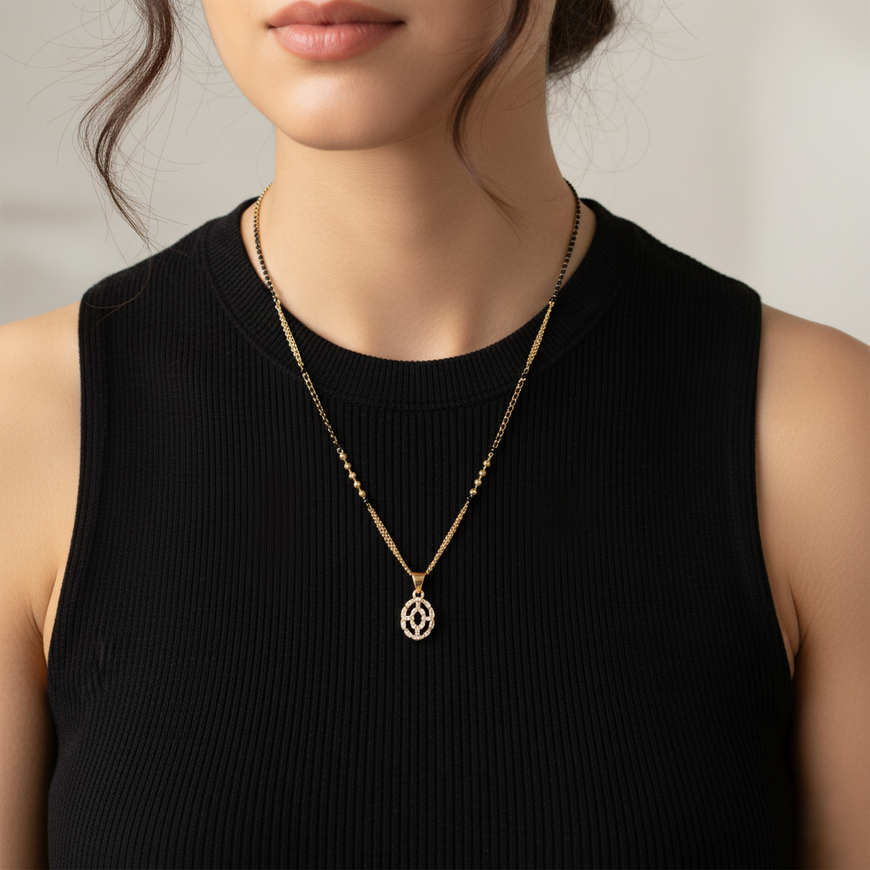 Selena Interlace Mangalsutra features a sophisticated interlinked oval pendant beautifully studded with shimmering stones. The dual-chain design paired with traditional black beads adds a perfect blend of elegance and modern charm. Lightweight, stylish, and versatile, it’s an ideal piece for women who love subtle luxury in their everyday look.