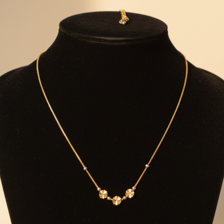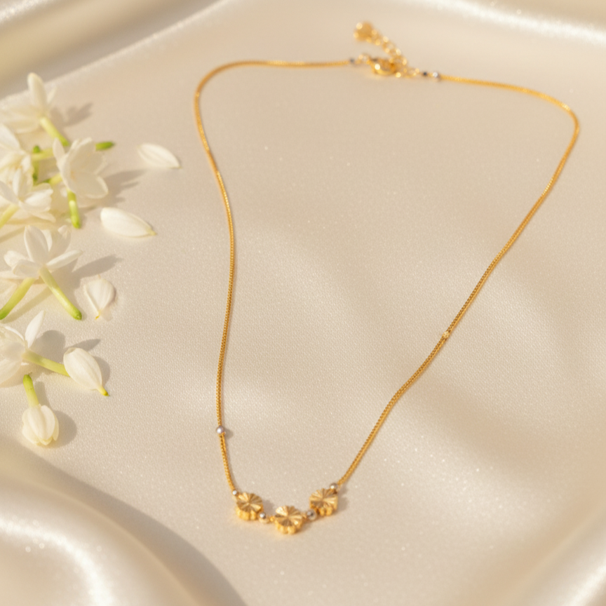 Ziya SunKnot Mangalsutra is all about understated elegance. The trio of golden sunburst beads at the center brings a warm, radiant charm, symbolizing positivity and new beginnings. Paired with a sleek, lightweight chain accented with tiny bead details, this design is perfect for women who prefer minimal, graceful jewelry that suits everyday style effortlessly.