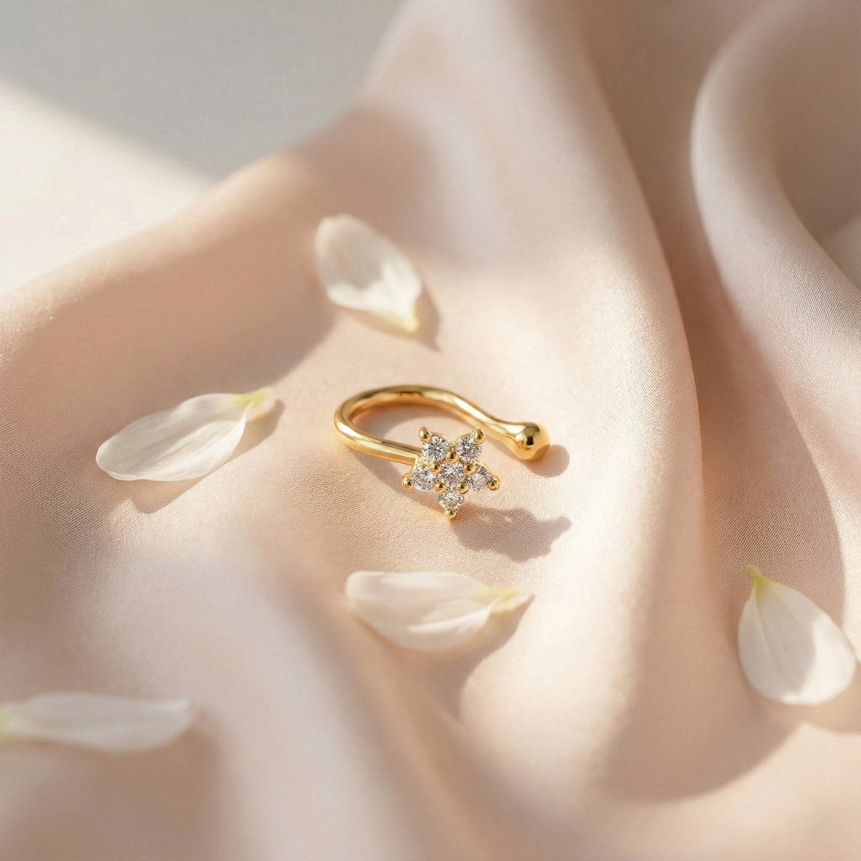 A sparkling flower-shaped nath crafted with radiant zircon petals on a sleek gold loop, adding a soft, elegant glow to everyday and festive looks effortlessly.