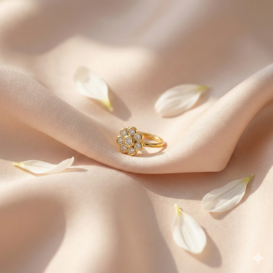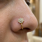 A radiant floral nath featuring a sparkling cluster of stones, blending elegance and tradition. Its soft gold curve adds charm, making it perfect for festive and everyday wear.