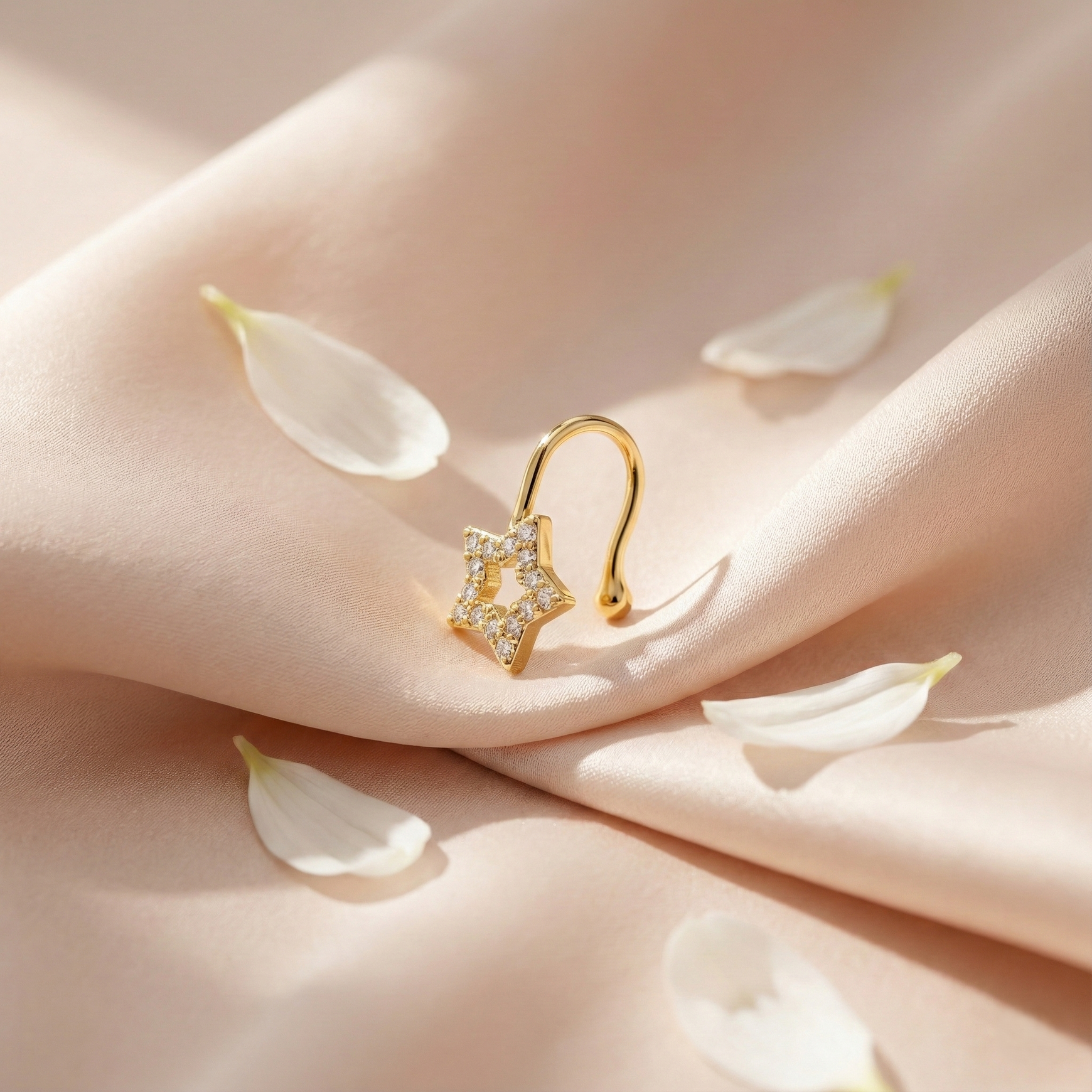 A delicate star-outline nose pin sparkling with fine zircons, Tārārekh Nath adds a dreamy celestial charm, perfect for elevating everyday elegance with a subtle golden glow.