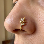 A graceful leaf-inspired nose ring adorned with sparkling zircons, Kisalaya Nath brings a fresh, nature-touched elegance, perfect for everyday beauty with a soft golden glow.