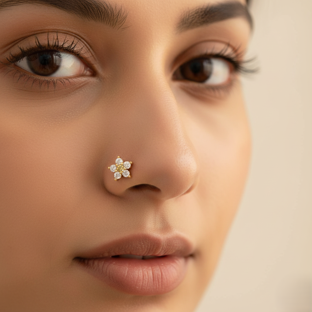 Elegant floral nosepin with sparkling cubic zircons set in gold-tone finish, adding timeless charm and effortless shine to everyday and festive looks.