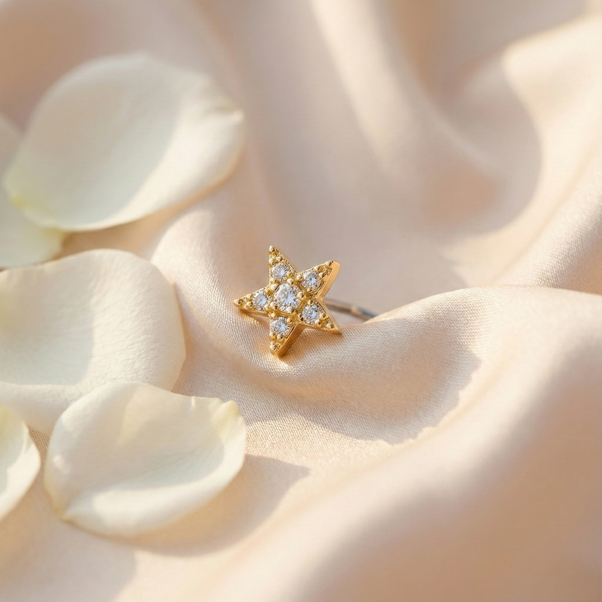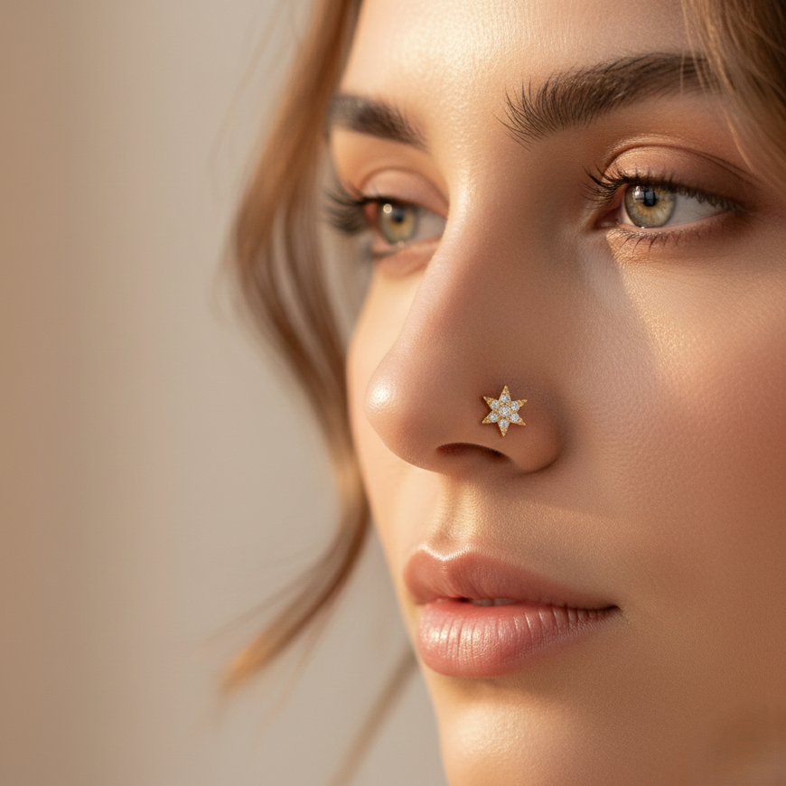 A delicate star-shaped nose pin studded with sparkling CZ stones, crafted in glossy gold-tone finish. Elegant, lightweight, and perfect for adding celestial charm to everyday looks.