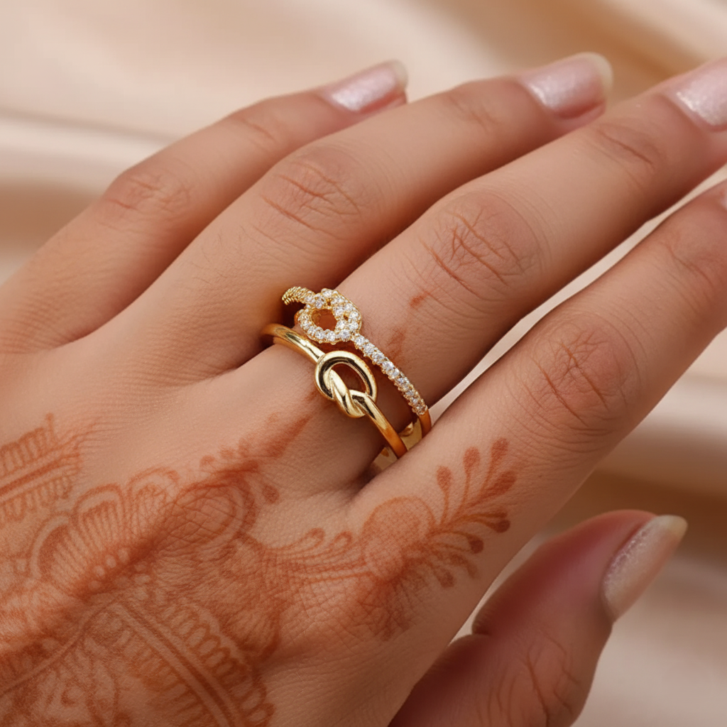 A polished gold ring with a sculpted knot and shimmering zircon accents. Lightweight, adjustable, and stylish ideal for modern fashion lovers seeking subtle luxury