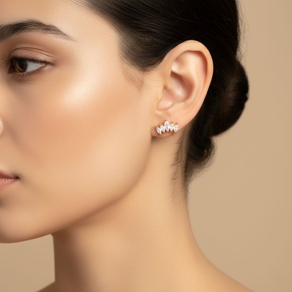 Dainty crown-shaped gold studs with marquise crystals, adding a soft, royal shimmer perfect for everyday elegance or festive charm.
