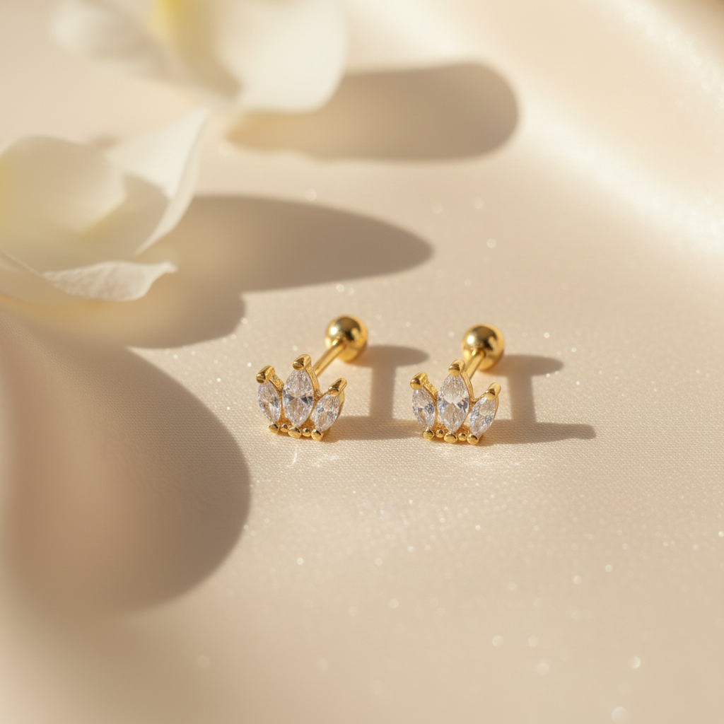 Delicate lotus-inspired studs with marquise crystals and gold detailing, bringing a serene, graceful sparkle to your everyday look.