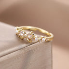 A delicate gold-tone ring adorned with crystal bows and tiny pearls, capturing playful elegance with a refined sparkle for everyday and occasion wear.